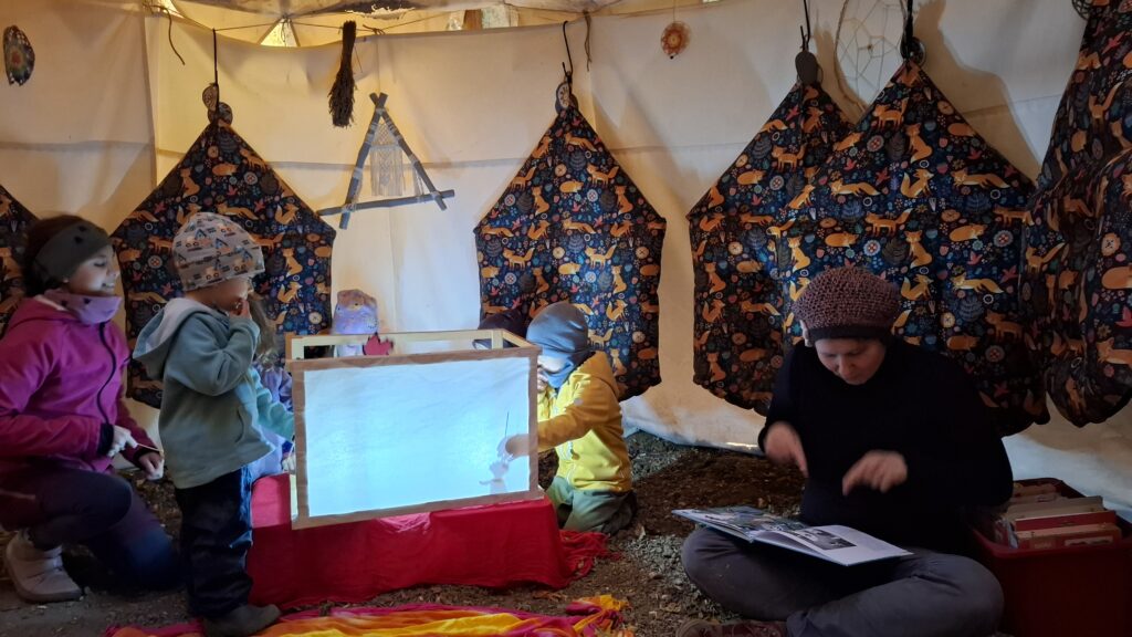 Bylo nasnadě, že jsme následně nějaké pasáže přehráli i s našimi loutko/stíhoherci v týpí. A rozhodně naše lesinkové provedení příběhu mělo také úžasné kouzlo! Blížil se totiž svatomartinský týden, a k němu se stínohra vyloženě hodí….