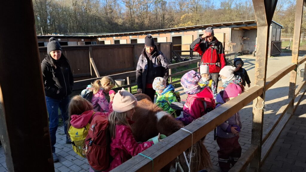 Na svatého Martina jsem se připravili i na pátečním výletě. Začali jsem ho společně návštěvou stájí Estavela. Bylo moc hezké nahlédnout do koňských pokojíčků, zjistit, kolik sena takový kůň sežere za jeden den, seznámit se s poníkem Barunkou, která se trpělivě nechala hřebelcovat skoro od všech našich dětí, bylo moc pěkné nakouknout pod ruku lidí “od koní”, poznat tu každodenní lopotu, ale i krásu.
