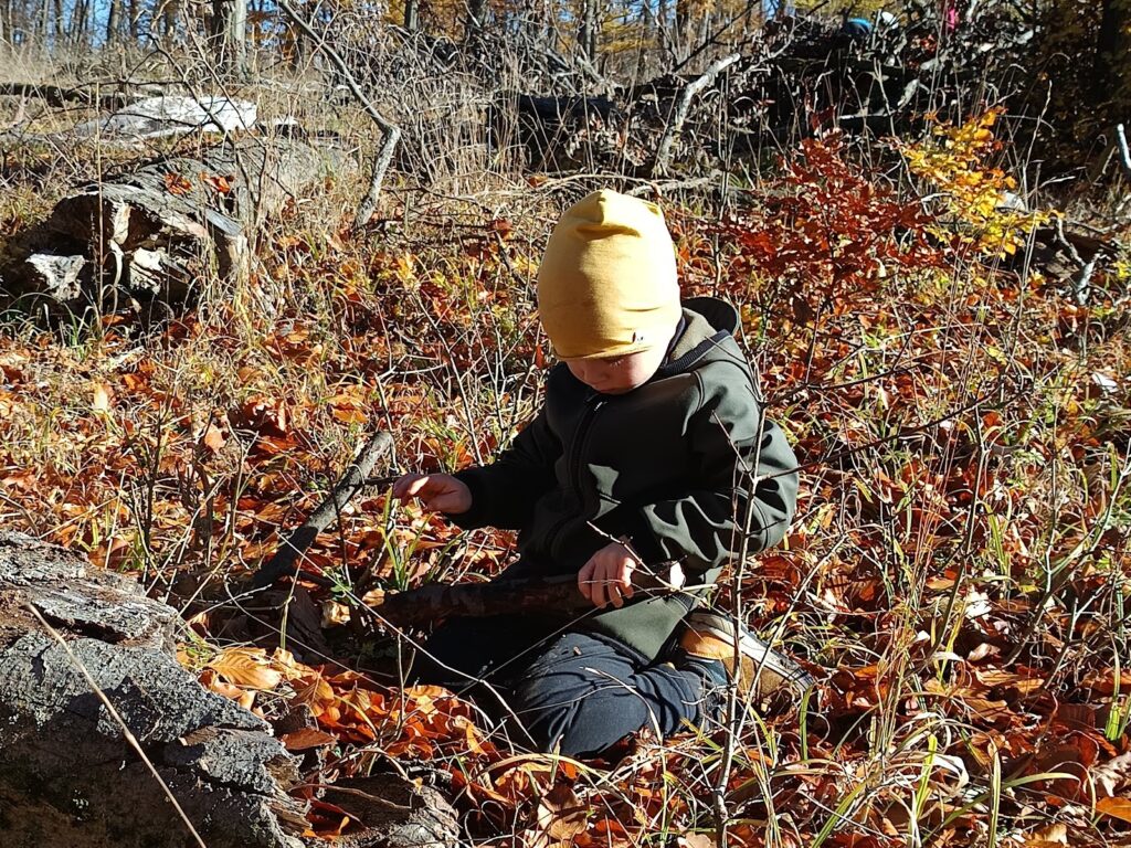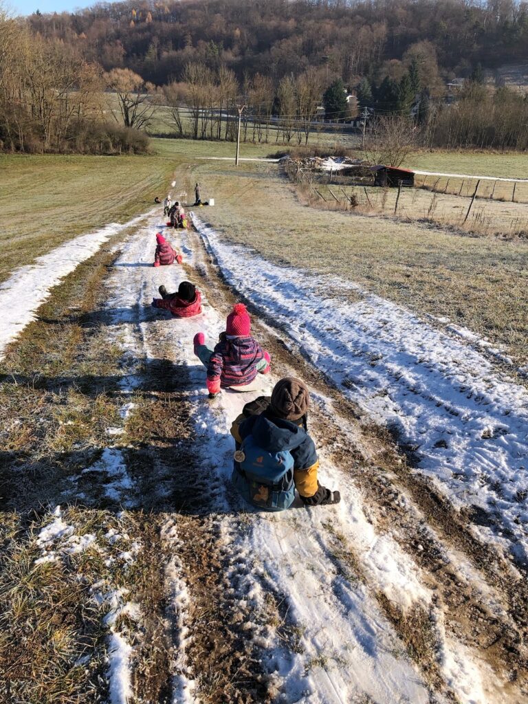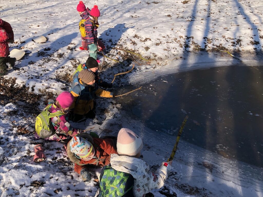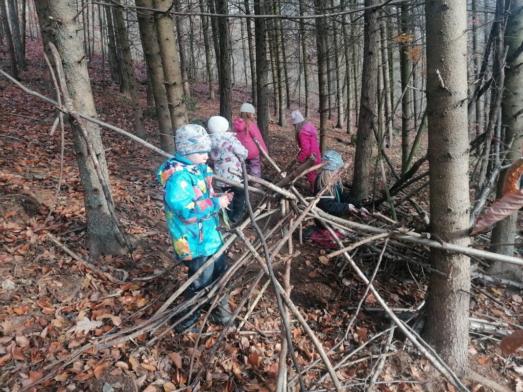 Jak nám mezi těmito událostmi bylo v lese? Krásně! Běhali jsme, užívali si deště i vody, tvořili z barevného listí, hráli jsme divadlo – tentokrát BOUDO, BUDKO. Pak jsme také stavěli úplně úžasný domek, který neustále zvelebujeme. Prožili jsme i příběh o cvrčkovi a mravencích a baví nás šátky a tanec v jurtě! Čím dál blíže k nám chodí muflonci, to asi jak jim ubývá přirozené potravy :). No a aby toho nebylo málo, tak nám Martin nakonec přinesl tu bílou peřinu! Zkoumali jsme led, jezdili jsme na pekáčích co to šlo, někdy pod námi bylo už jen bláto, ale kdo by si nechal kazit radost, že? Děkujeme za trpělivost při přebírání zablácených svršků, ono to asi v lese jinak moc nejde – zkrátka senzory play jak vyšitá! 🙂