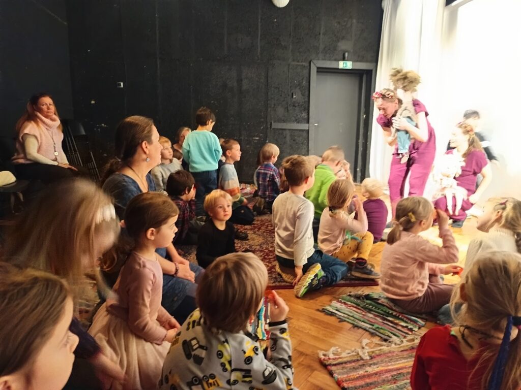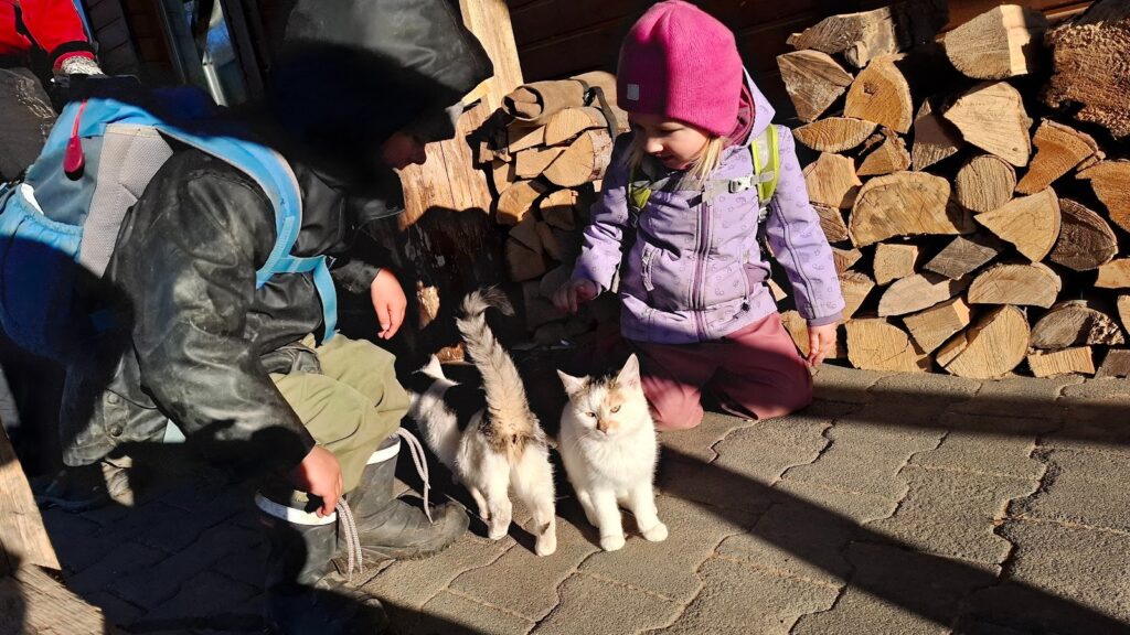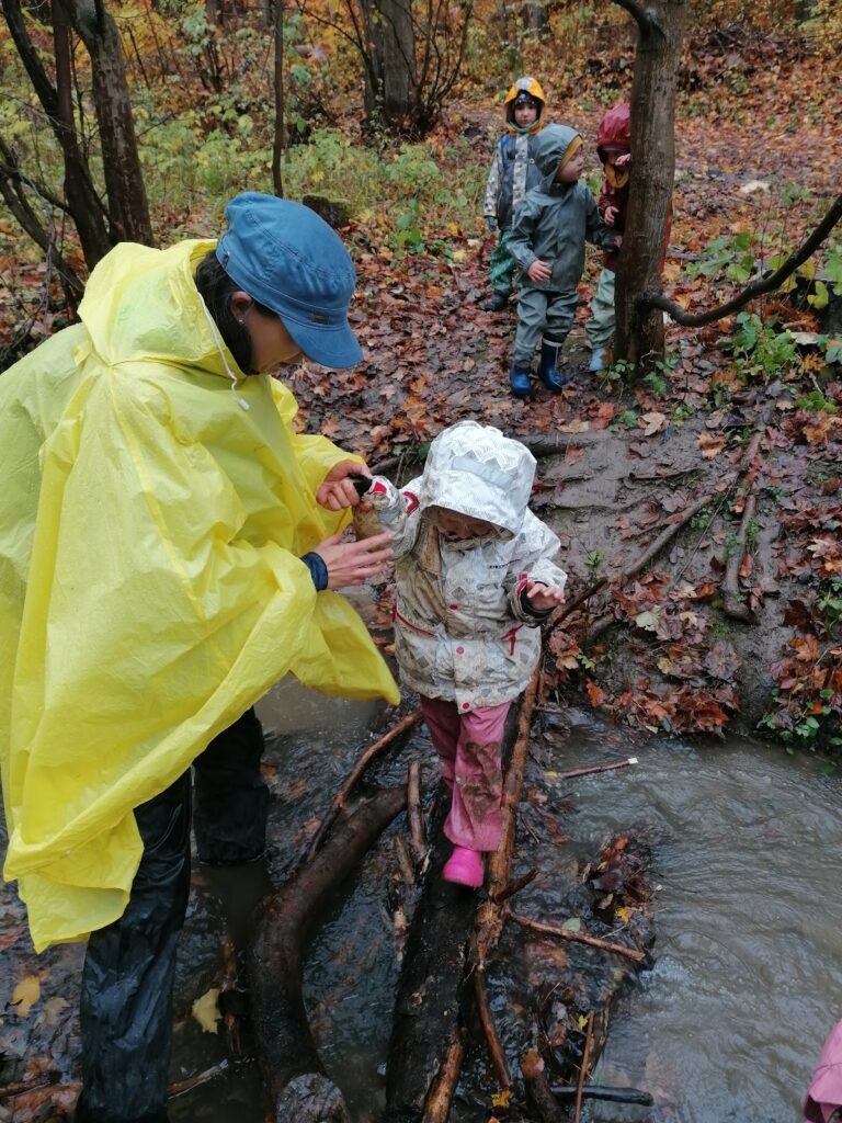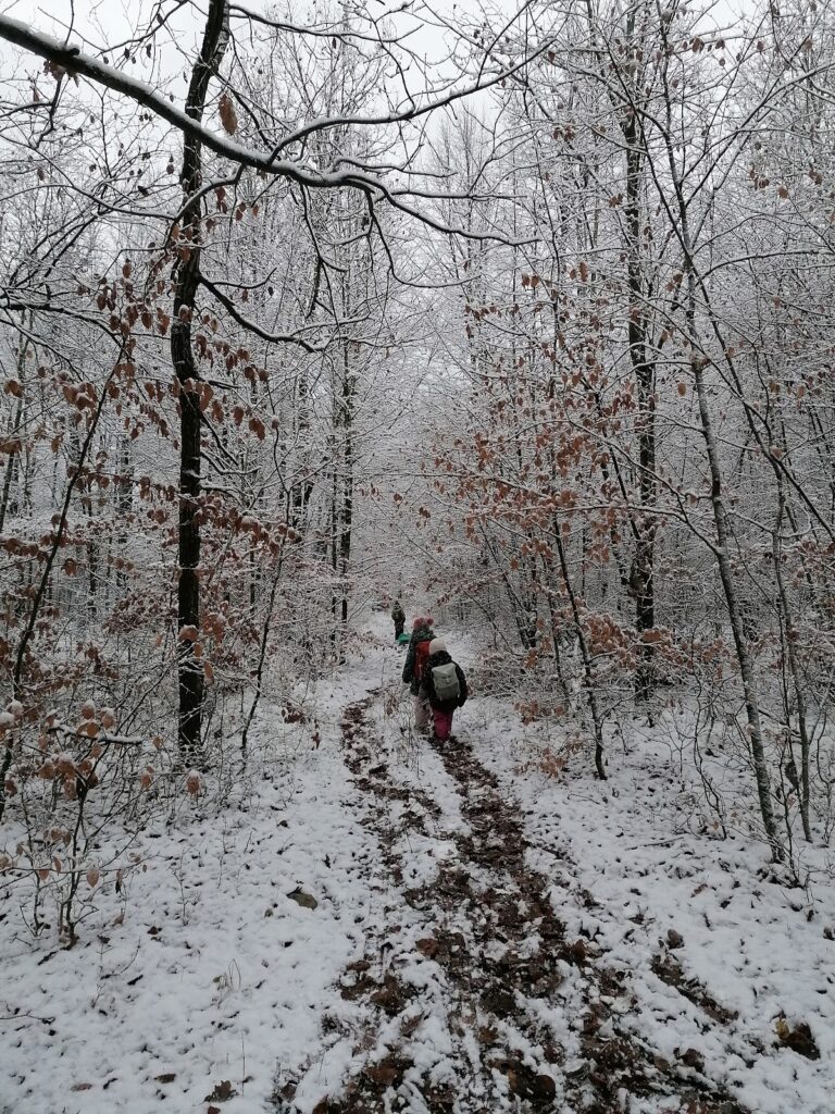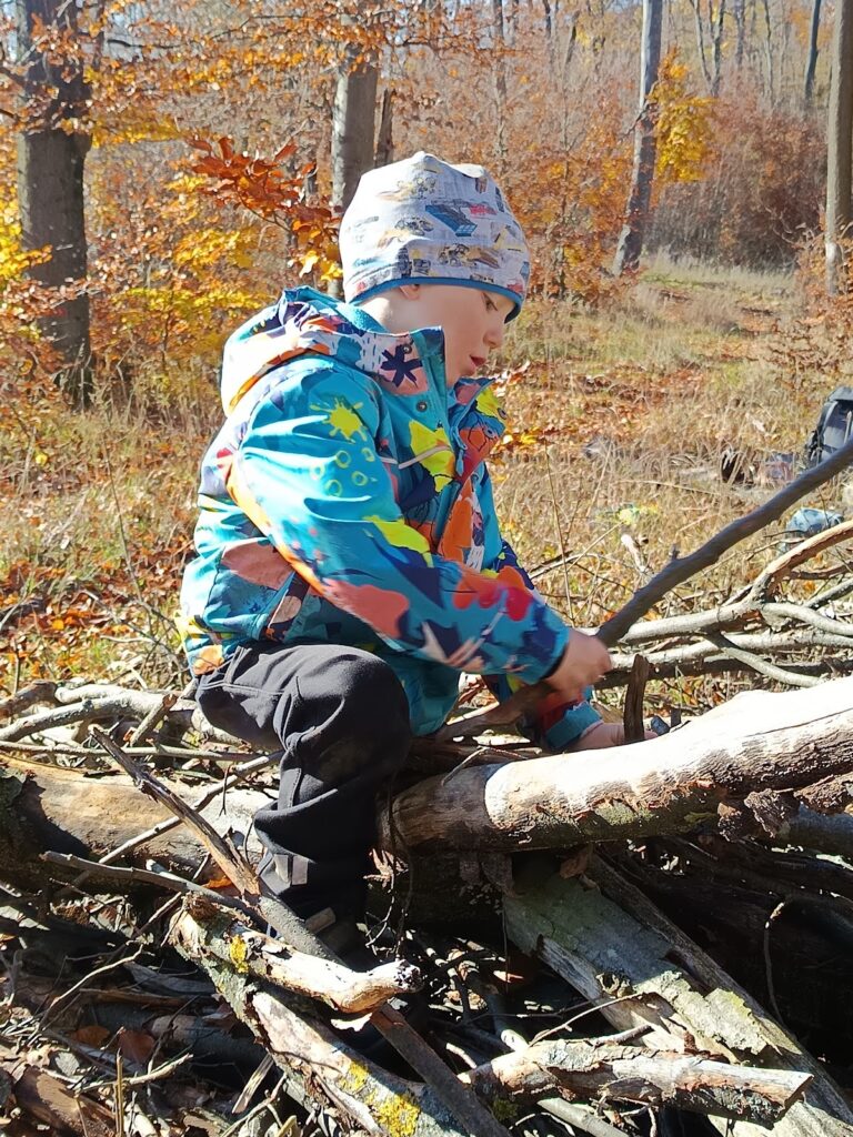 Jak nám mezi těmito událostmi bylo v lese? Krásně! Běhali jsme, užívali si deště i vody, tvořili z barevného listí, hráli jsme divadlo – tentokrát BOUDO, BUDKO. Pak jsme také stavěli úplně úžasný domek, který neustále zvelebujeme. Prožili jsme i příběh o cvrčkovi a mravencích a baví nás šátky a tanec v jurtě! Čím dál blíže k nám chodí muflonci, to asi jak jim ubývá přirozené potravy :). No a aby toho nebylo málo, tak nám Martin nakonec přinesl tu bílou peřinu! Zkoumali jsme led, jezdili jsme na pekáčích co to šlo, někdy pod námi bylo už jen bláto, ale kdo by si nechal kazit radost, že? Děkujeme za trpělivost při přebírání zablácených svršků, ono to asi v lese jinak moc nejde – zkrátka senzory play jak vyšitá! 🙂